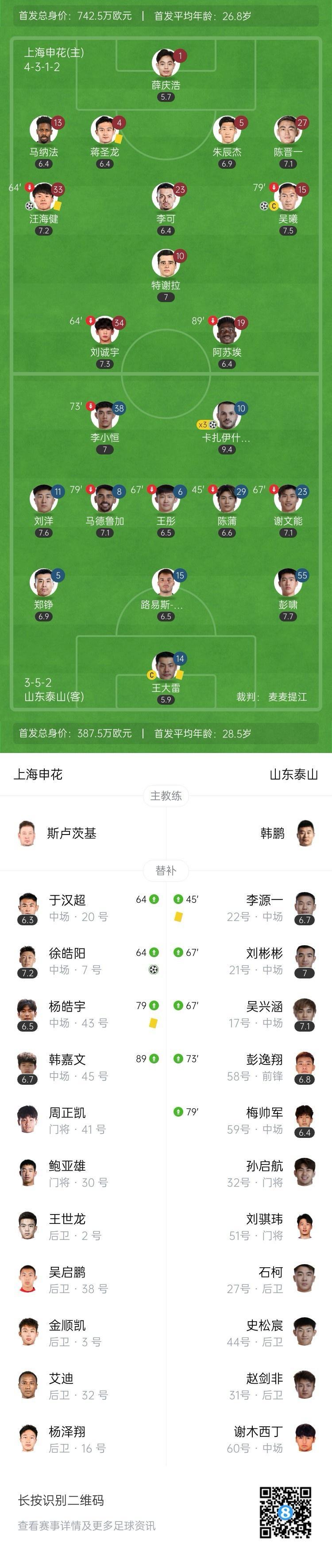 第40分钟,刘诚宇前场积极拼抢拿到球权,他在突破时被出击的王大雷撞倒,主裁判吹罚点球。第42分钟,吴曦操刀主罚命中,申花2-1领先泰山。↓